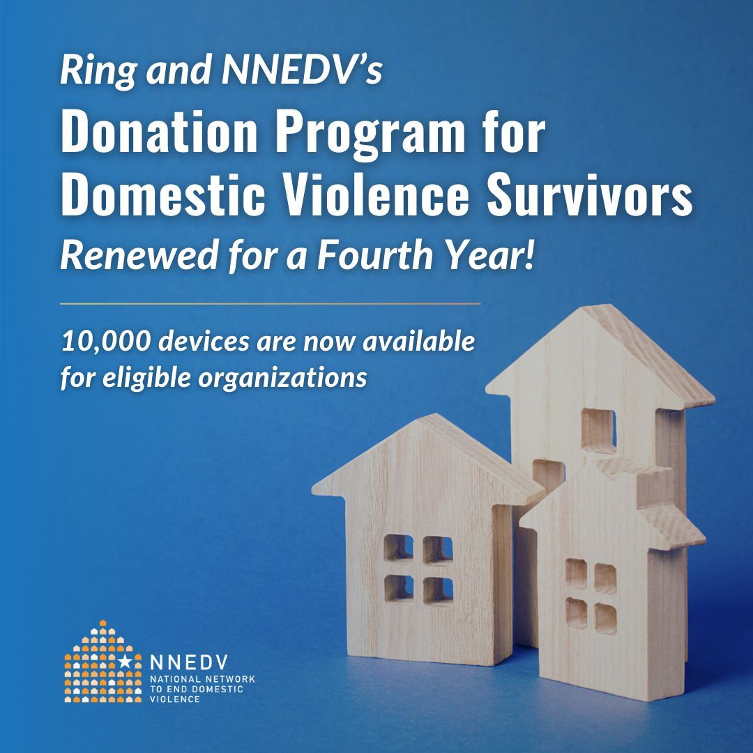 | Ring and NNEDV are pleased to announce the fourth year of our Ring Donation Program for Domestic Violence Survivors! An additional 10,000 devices are now available for domestic violence organizations, which provide them to survivors interested in using them as part of their safety plans. |