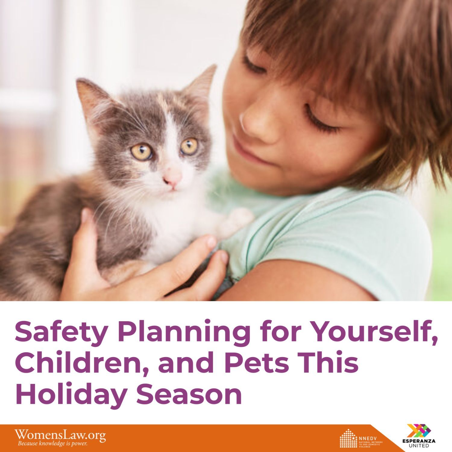 | | | | For survivors of domestic violence, the holiday season can be particularly challenging, often intensifying the stress and trauma of abusive environments. Learn how to create a safety plan for yourself, your children, and your pets, with guidance from NNEDV’s WomensLaw team and Esperanza United |