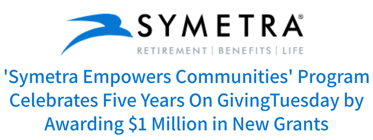 | | | | | | | | “As GivingTuesday gets underway, Symetra Life Insurance Company is celebrating the fifth anniversary of its signature corporate giving program, ‘Symetra Empowers Communities,’ with $1 million in immediate and multi-year grants directed to 19 national and local nonprofits across the country [including the National Network to End Domestic Violence].” (Symetra) |